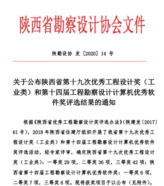 日前,陕西省勘察设计协会公布了陕西省第十九次优秀工程设计(工业类)奖和第十四届工程勘察设计计算机优秀软件奖评选结果,中交一公院共荣获17项奖励,其中:优秀工程设计(工业类)奖13项(一等4项、二等4项、三等5项),工程勘察设计计算机优秀软件奖4项(一、二等奖各2项)。