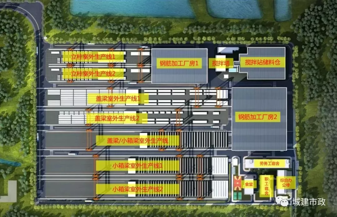 该生产基地拥有7条预制构件生产线,预制构件设计产能可达20万方/年 ,其中预制立柱产能约2000根/年、预制盖梁产能约1000榀/年、预制箱梁产能约2000榀/年。